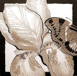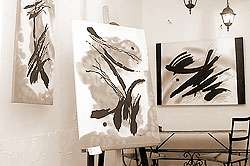 Небольшая изящная экспозиция, открывшаяся на прошлой неделе в галерее  «Герцена, 6» -казалось бы, полная противоположность этому пафосу. Судите сами: основная часть выставки – это… расписные шёлковые платки. Плюс несколько работ, выполненных в той же – роспись по ткани – технике, хоть и не столь «утилитарного предназначения» (это всё-таки «картины»), но также вроде бы вполне легкомысленны и воздушны – материал обязывает…