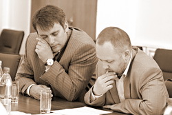 | Андрей Морозов (справа) и Виктор Остренко (слева) даже на сессии областного Собрания не могли оторваться от магических цифр результатов социологических опросов. Теперь организаторов этих исследований будет финансировать областной бюджет. Фото: Александр Сидоренко |