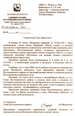 Письмо заслуживает обширного и бережного цитирования (орфография и стилистика сохранены полностью): «В номере 44 газеты «Псковская губерния» от 14-20.11.07 г. Была опубликована статья Елены Ширяевой «Земля отцов» [ 1 ], в которой осуждались и признавались незаконными действия Главы муниципального образования «Пустошкинский района», издавшего распоряжения о предоставлении в аренду земельного участка площадью 1500 кв. м. в черте городского поселения «Пустошка» для ведения личного подсобного хозяйства семье своего сына.