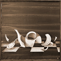 Это впечатление не было нарушено (а, скорее, укреплялось) почти «обманочной» иллюзорностью, которой достигает Е. Матько, к примеру, в своих натюрмортах – в изображении разбитой посуды, шахматных фигур и т. п. Колорит Матько, при всей его сбалансированности и гармонии, полностью подчинён графическому началу. Пластика странных форм, которые культивирует автор, выражена преимущественно рисунком. На большинстве представленных холстов отсутствует выявленная красочная фактура, структура различимых мазков – всё, к чему приучила нас за последние полтора века прошедшая опыт импрессионизма, но опирающаяся на реальность живопись. Там же, где автор применяет пастозный мазок-штрих (к примеру, в композиции «Хождение по водам», к которой мы обратимся ниже), сам характер изображаемого столь вымышлен и нереален, что исключает какие-либо ассоциации с натурным письмом.