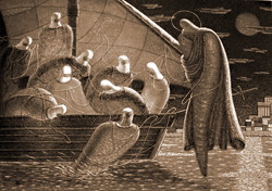 Обратимся к главному экспонату выставки – картине «Хождение по водам» (1993 г., х., м., 105 х 150 см.). Она, казалось бы, в точности следует евангельскому рассказу. Есть здесь и лодка под звонким, наполненным ветром парусом, и озеро, и берег вдали, а над всем – космичное небо, неровное кровавое светило которого (не дневное и не ночное) окружено вместо облаков как бы пергаментными свитками, свернувшимися вдруг в руках невидимых ангелов. Есть здесь словно бы и Господь, и маловерный Пётр – вот он, ступивший на воду, начинает шумно тонуть, усомнившись. Группа смятенных учеников в лодке очень выразительна: мы почти видим их жестикуляцию – заломленные руки, недоумение и страх. Архетипическая, входящая в круг глубочайших всемирных мифов, мистерия подробно и обстоятельно сыграна перед нами.