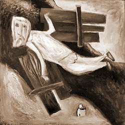 Посмотрим на картину «Крестьянин, покидающий мир» (1978, х. м.). Серая фигура в домотканой рубахе, «окрылённая» двумя фрагментами какого-то дощатого забора, воспарила над скудным русским пейзажем – над церковью и темной рекой. «Русский Икар» (или, скорее, митьковский «Икарушка») – востребованная многими тема. Да, перед нами полёт – но это не взлёт шагаловских влюблённых на пике счастья, не однократный ведовской восторг Маргариты из романа Булгакова. В полёте крестьянина на картине Д. С. Кондратьева радости мало. Вернее – это посмертная радость: облегчение, принятое как воздаянье. В какой-то миг при взгляде на картину отчаянье и ужас (утверждённые серым выцветшим колоритом) концентрируются достаточно сильно, чтобы понять: дощатые крылья – это в большой степени крышка гроба, но, может быть, уже взломанная по последнем Воскресении?