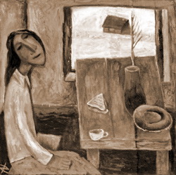 Вот перед нами картина «Птицы над башнями» (х., м.), относящаяся к позднему периоду художника одна из лучших его работ. Высоко в небе журавли, близко придвинутые к нашему взгляду, кружат над новгородским кремлём. «Птицы над городом» - что может быть проще, знакомей? Эта тема развита тысячами авторов. Но Дмитрий Кондратьев наполнил свой холст столь тонкой живописной красотой и свежестью, что, заглядевшись, не успеваешь удивиться: «Художник (и я, зритель, с ним) парим выше птиц, вровень с ними!». Этот взгляд на мир «оттуда» (с точки зрения Бога) роднит – внутри, не напоказ – искусство Кондратьева с иконописью. Во всяком случае, пространство его работ – не реальное, иное.