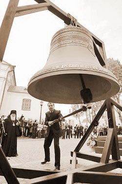 Дмитрий Медведев потянул за красный канат, привязанный к языку колокола, и с третьего маха двухтонная махина, настроенная на ноту «си» малой октавы, подала голос.