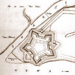 На месте Ниеншанца и его округи стоял шведский купеческий город-крепость Ландскрона с большим населением. Сооруженная шведами в устье Охты в 1300 г., крепость по словам летописи, «утвердиша ее твердостью несказанной». Делал ее «нарочитый» мастер, приехавший из Рима. Во время раскопок укрепление предстало действительно огромным. Прямоугольное в плане, оно вместе со рвами занимало площадь 17 000 кв. м. Однако уже через год новгородские войска взяли эту крепость «твердость та не во что же бысть». Фортеция было сожжена, а земляные укрепления «разгребоша».