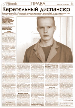 В октябре 2009 года в статье «Карательный диспансер» «Псковская губерния» рассказала историю 18-летнего солдата-срочника Игоря Хлупина, который, отслужив и трех месяцев, сначала оказался на принудительном лечении в псковской областной психиатрической больнице «Богданово», а затем – в психиатрическом отделении Санкт-Петербургского окружного госпиталя. Всё это произошло после того, как он написал заявление в военную прокуратуру об издевательствах, которым подвергался в Псковской десантно-штурмовой дивизии [ 1 ]. 1 ноября 2009 года Игоря комиссовали: военно-врачебная комиссия в Санкт-Петербурге заменила категорию годности к военной службе «А» на категорию «негодности» - «Д». А войсковая часть 07264 (официальное наименование 76-й ДШД) 16 ноября подала в Псковский городской суд исковое заявление о защите деловой репутации к газете «Псковская губерния». В документе, подписанном лично командиром дивизии полковником Игорем Виноградским, было заявлено, что опубликованные газетой сведения не соответствуют действительности, дискредитируют командование и врачей части, необоснованно порочат их деловую репутацию.
