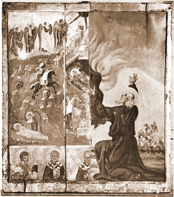 | Псковский шедевр – икона XV века «Рождество Христово» в процессе раскрытия от сплошной записи XIX века (ВХНРЦ им. Акад. И. Э. Грабаря, 1969 г.). Слева – подлинная живопись XV века. Справа – карикатурная запись, изображающая «Огненное восхождение Пророка Илии». Фото: Псковский государственный музей-заповедник |