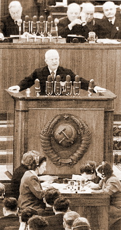 | Н. С. Хрущев на трибуне во время ХХ съезда КПСС. 14 февраля 1956 г. |