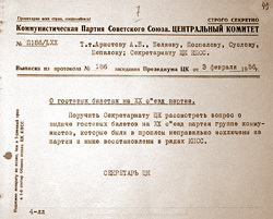 | Выписка из секретного протокола заседания Президиума ЦК КПСС «О гостевых билетах на XX съезд партии», в соответствии с которым на съезд в качестве гостей были приглашены незаконно исключенные из КПСС члены партии. 3 февраля 1956 г. |