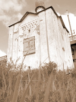 | После разрушения Ольгинского моста и прилегающей к нему насыпи Анастасиевская часовня осталась сиротливо стоять на высоком каменном основании. 1970 г. Фото Михаила Ивановича Семенова. |