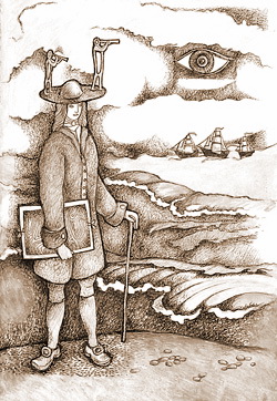 Сам Илья Сёмин предстал перед публикой в трех лицах. Наверное, прежде всего, стоит сказать о его серии, посвященной Гулливеру. «Жажда путешествий в человеке – это всего лишь проявление веры в загробную жизнь, - написал художник в своем коротком эссе в буклете к выставке. – Мы всегда куда-нибудь неизбежно двигаемся». Сёминский Гулливер напоминает писателя, а лилипуты – буквы, которые автор щедро расставляет согласно стройному замыслу. Путешествие ГуллиВЕРА и вера в идеале должны слиться воедино.
