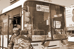 Отличились и настоящие полицейские. Из желтых автобусов с надписью «Осторожно, дети. Восточный округ» на Новый Арбат выходили полицейские совсем недетского вида.