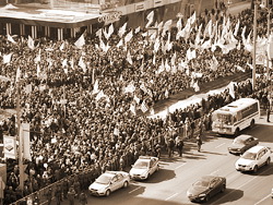 Националистов всегда было немного, но вели они себя на площадях очень организованно, шумно и провокационно. Однажды, на проспекте Сахарова, [ 3 ] попытались штурмом взять трибуну для журналистов.